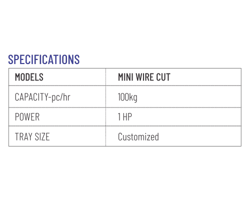 Our Mini Wirecut Machine is a compact and efficient solution designed for precision cutting of soft and semi-hard dough into uniform shapes. Ideal for cookies, biscuits, and other bakery products, this machine ensures consistent portioning, enhancing product quality and reducing manual effort. With its high-speed operation and user-friendly controls, the Mini Wirecut is perfect for small to medium-scale bakeries looking for precision and efficiency.